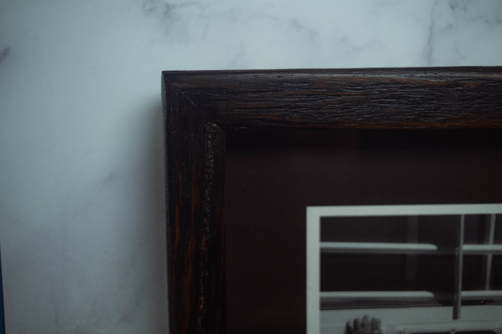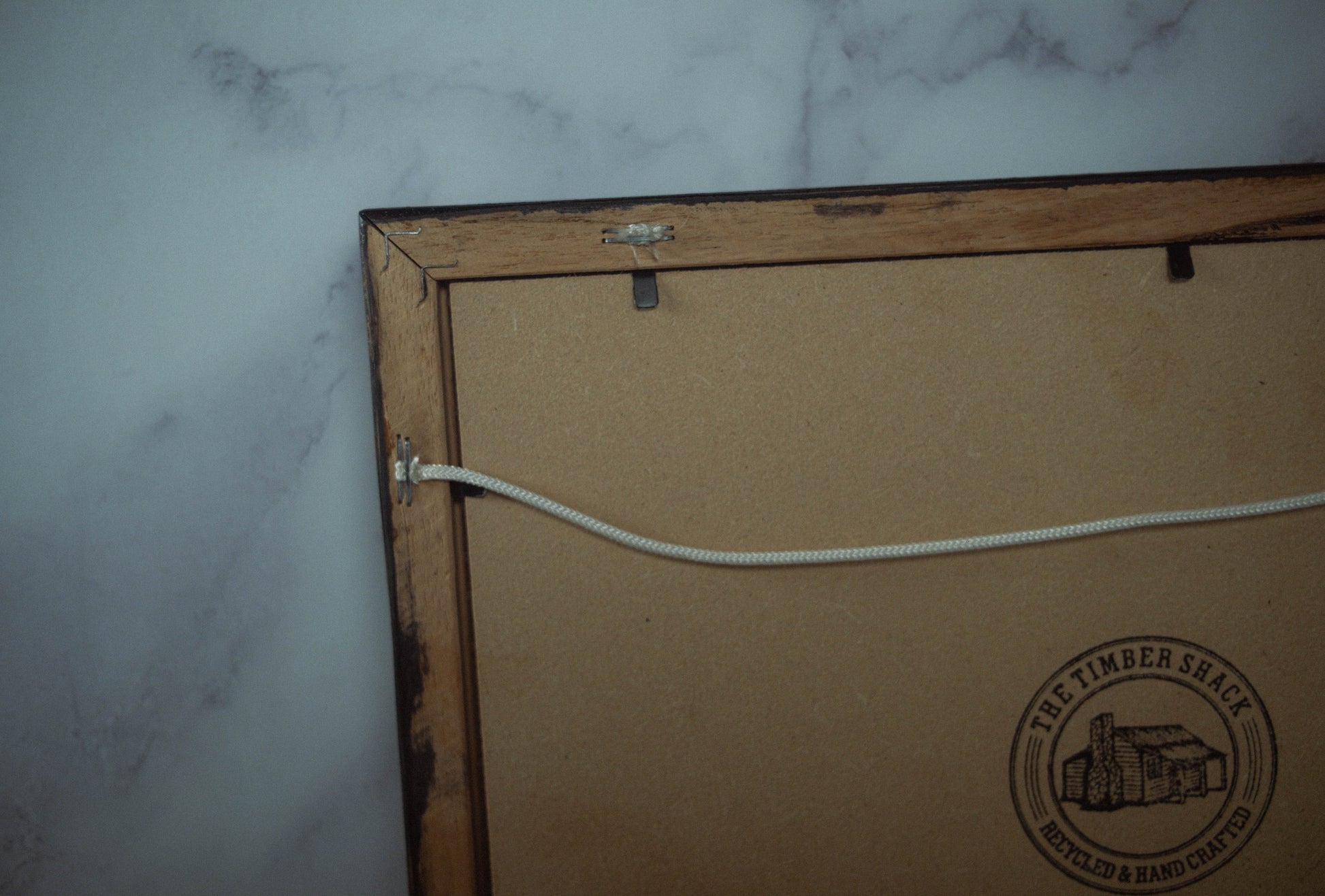 Each piece is finished in a handmade recycled wood frame, crafted in Melbourne. The frames are torched and stained black before being sanded back to reveal the grain beneath the surface. This process gives every frame slight variations — no two are identical.